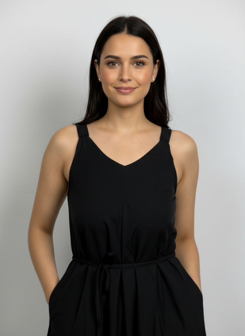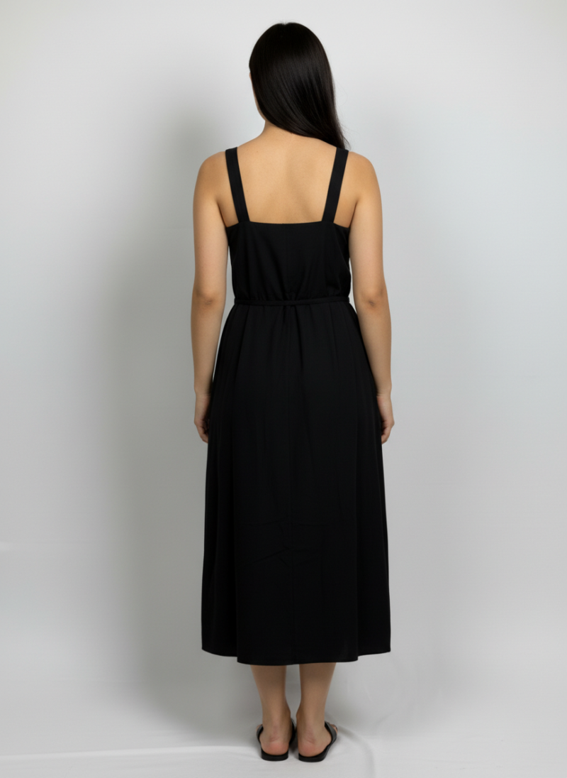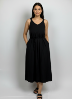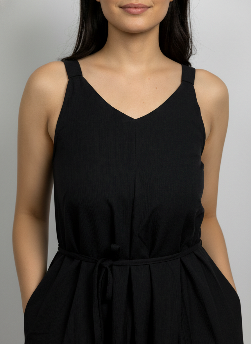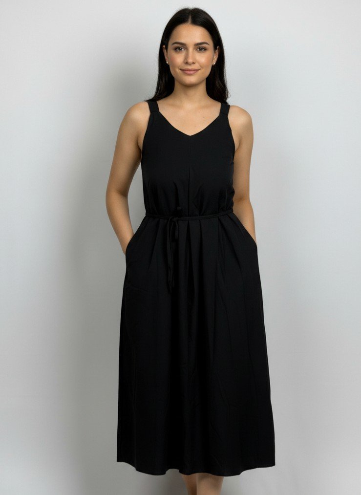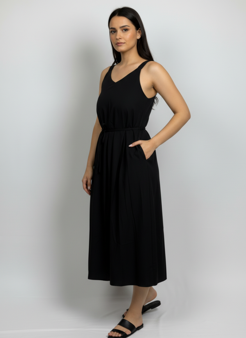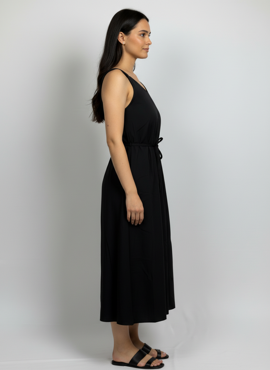 This is a black, sleeveless, midi-length dress featuring a V-neckline and a drawstring waist.