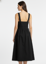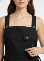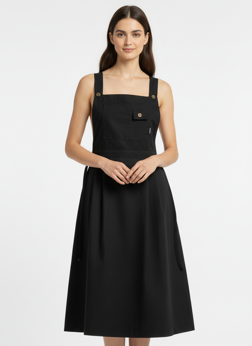 A black pinafore-style midi dress with wide button-detailed shoulder straps and a small buttoned pocket on the bib.