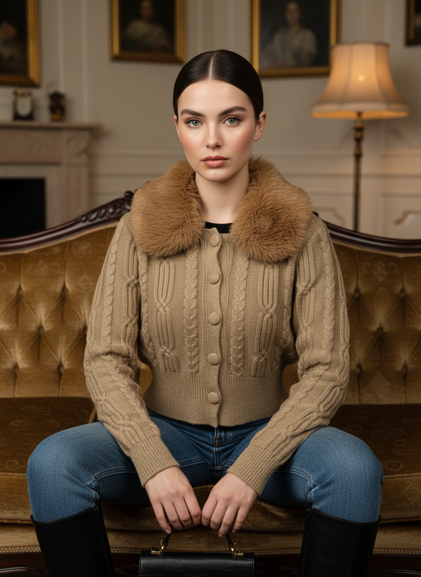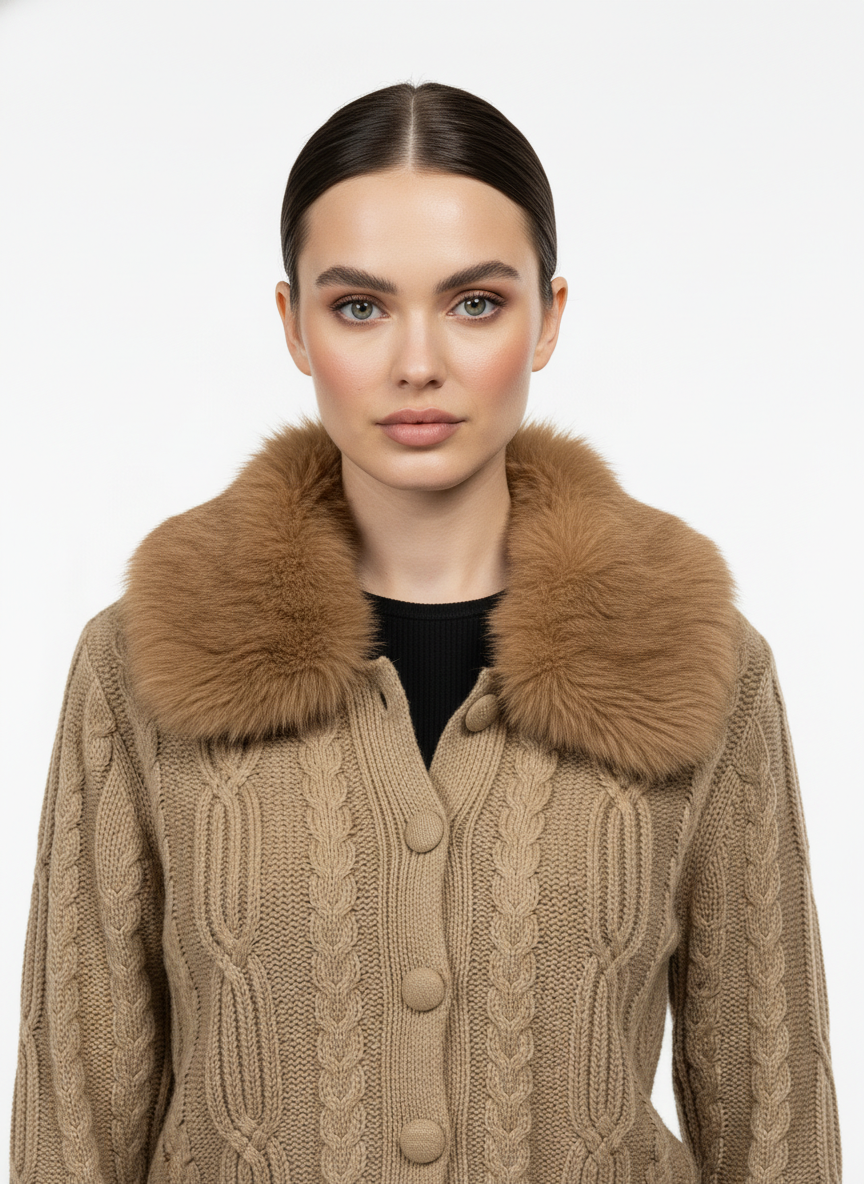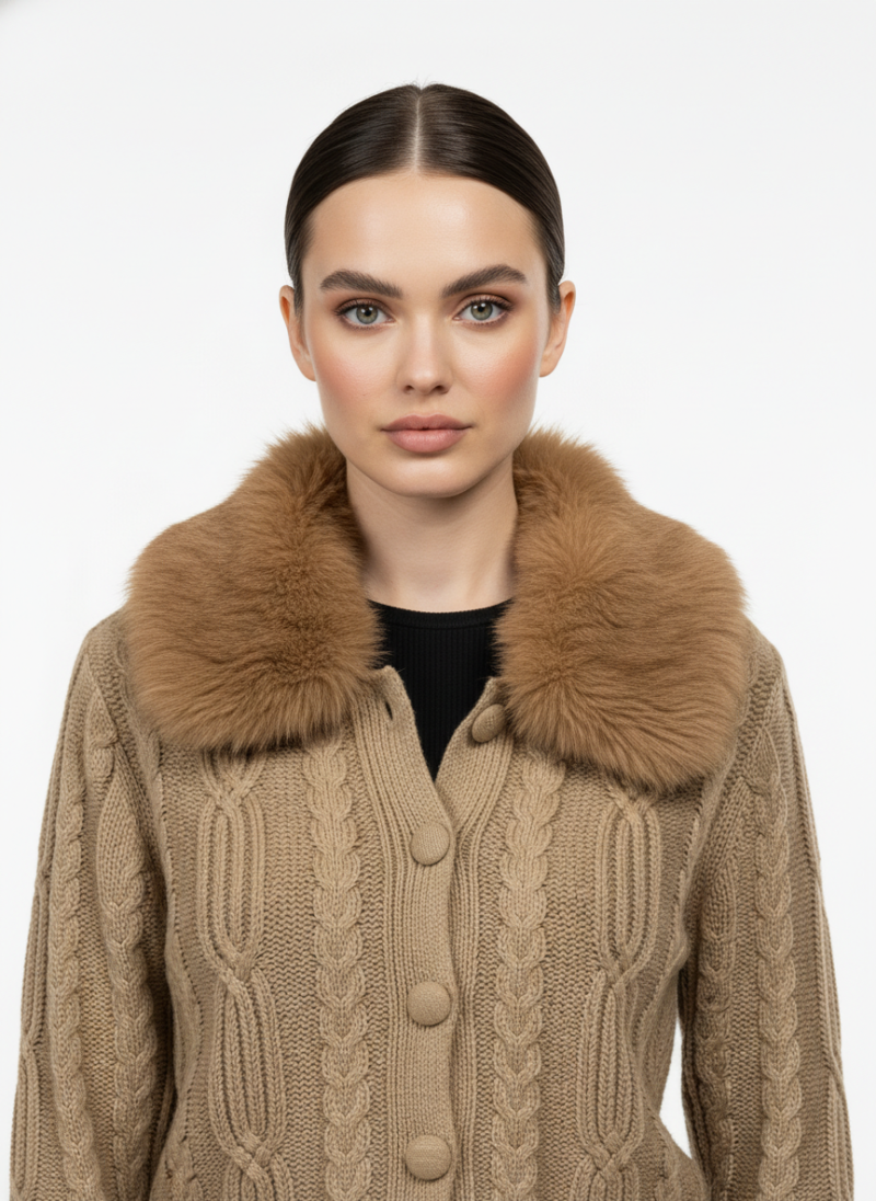 A camel-colored cable-knit cardigan featuring a plush faux fur collar, large tonal buttons, and ribbed cuffs and hem.