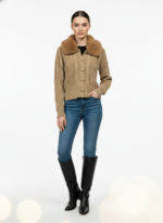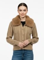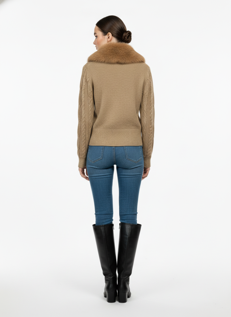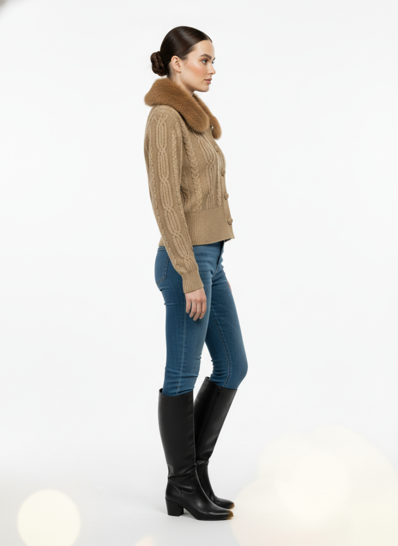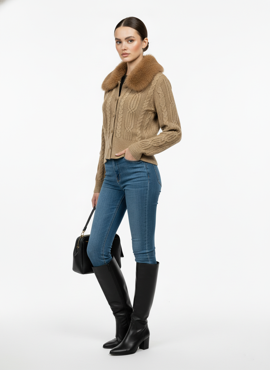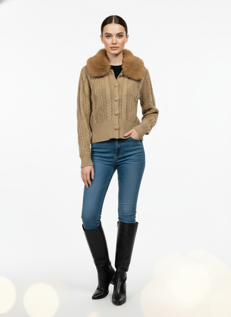 A camel-colored cable-knit cardigan featuring a plush faux fur collar, large tonal buttons, and ribbed cuffs and hem.