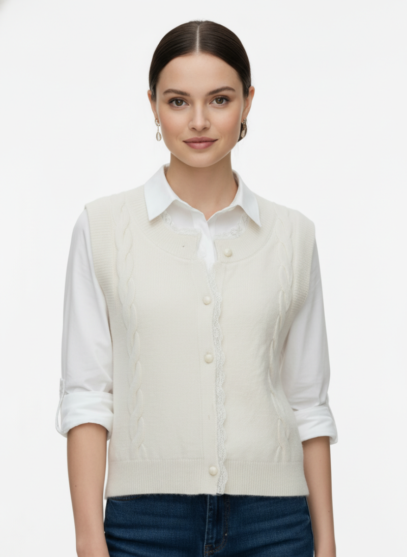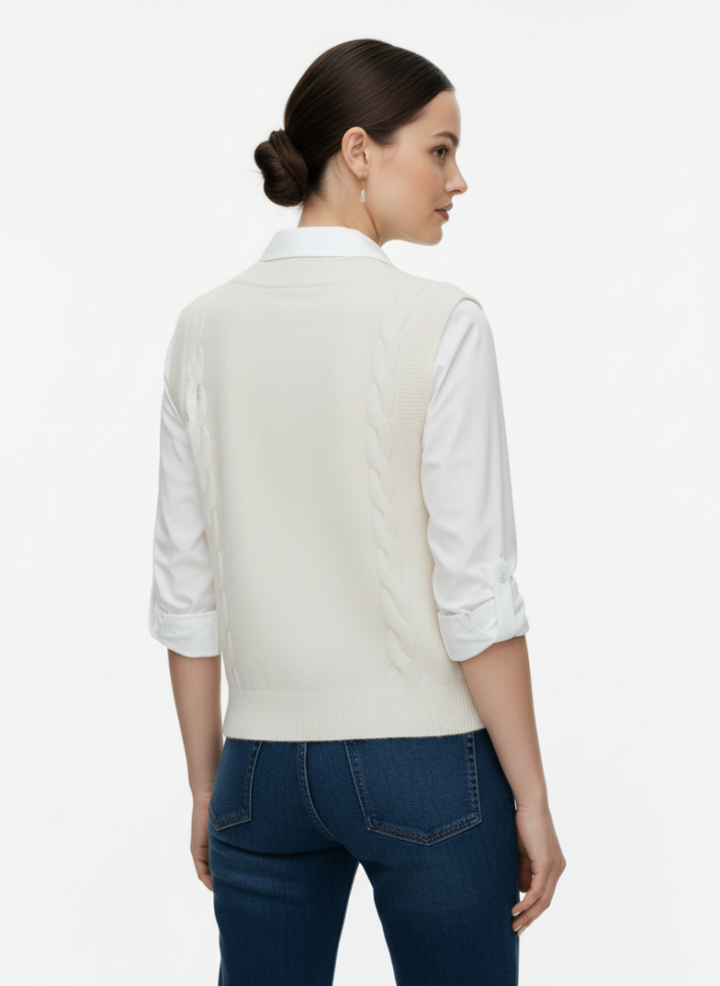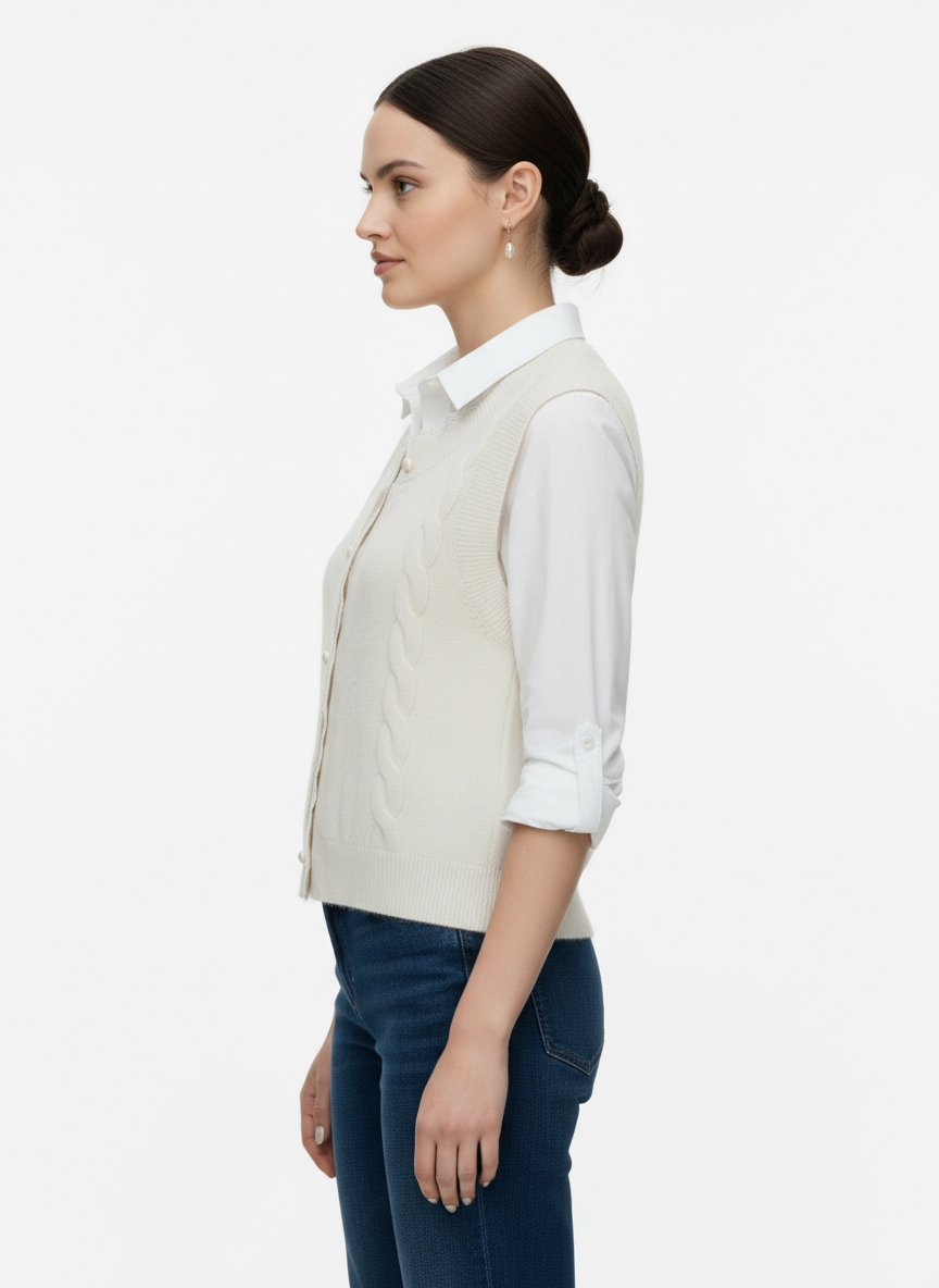 A white, sleeveless, cable-knit button-down vest with small round buttons and a ribbed hem, layered over a white collared shirt.