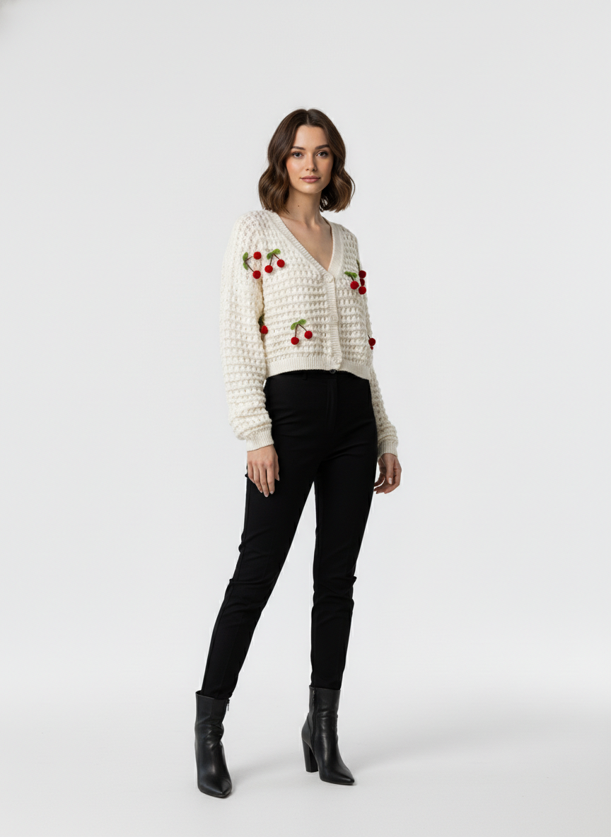 A cropped white open-knit cardigan with a V-neckline, button-down front, and red cherry pom-pom appliqués.