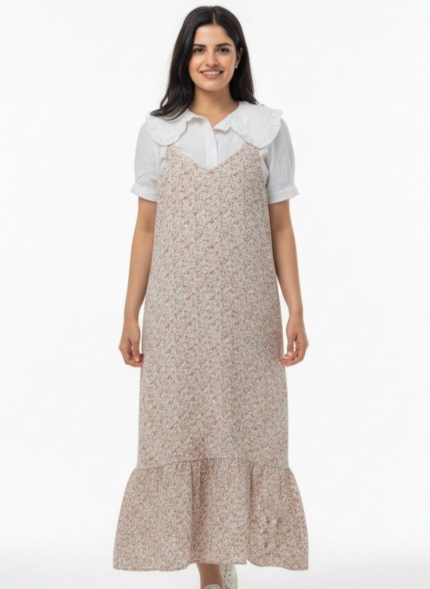A floral print maxi dress with a ruffled hem and a sleeveless top, styled over a white blouse.