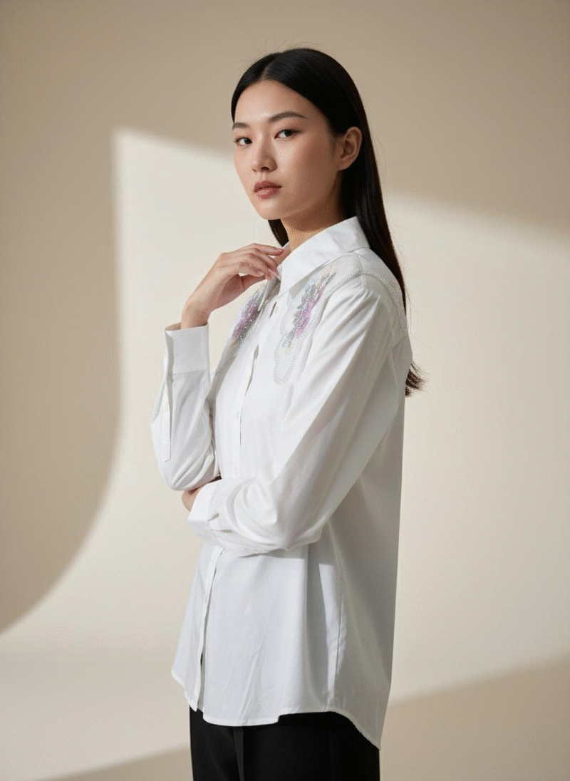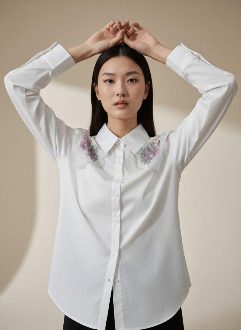 This crisp white button-up shirt features a unique and delicate design on the collar. The Peter Pan style collar is adorned with intricate floral embroidery in soft pastel shades of purple, blue, and light pink, outlined with a shimmering, almost iridescent thread. The flowers are arranged in two distinct clusters, one on each side of the collar, adding a touch of elegant embellishment to the classic shirt.