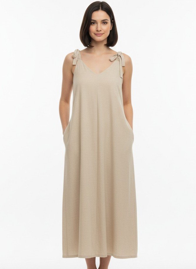 A beige sleeveless V-neck maxi dress with tie-up shoulder straps and side pockets.