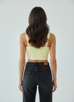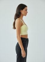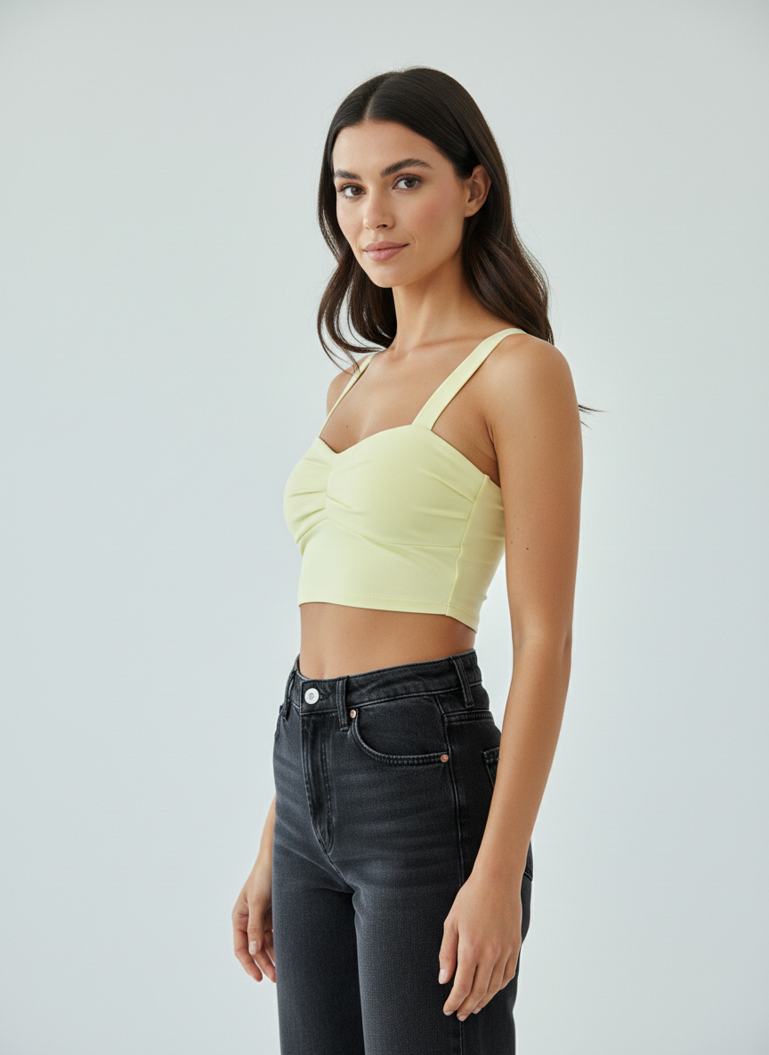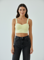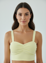 Pale yellow crop top with wide shoulder straps and a gathered center bust detail.