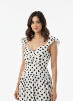 A woman wearing a white maxi dress with black polka dots, featuring ruffled shoulder straps and a front leg slit.