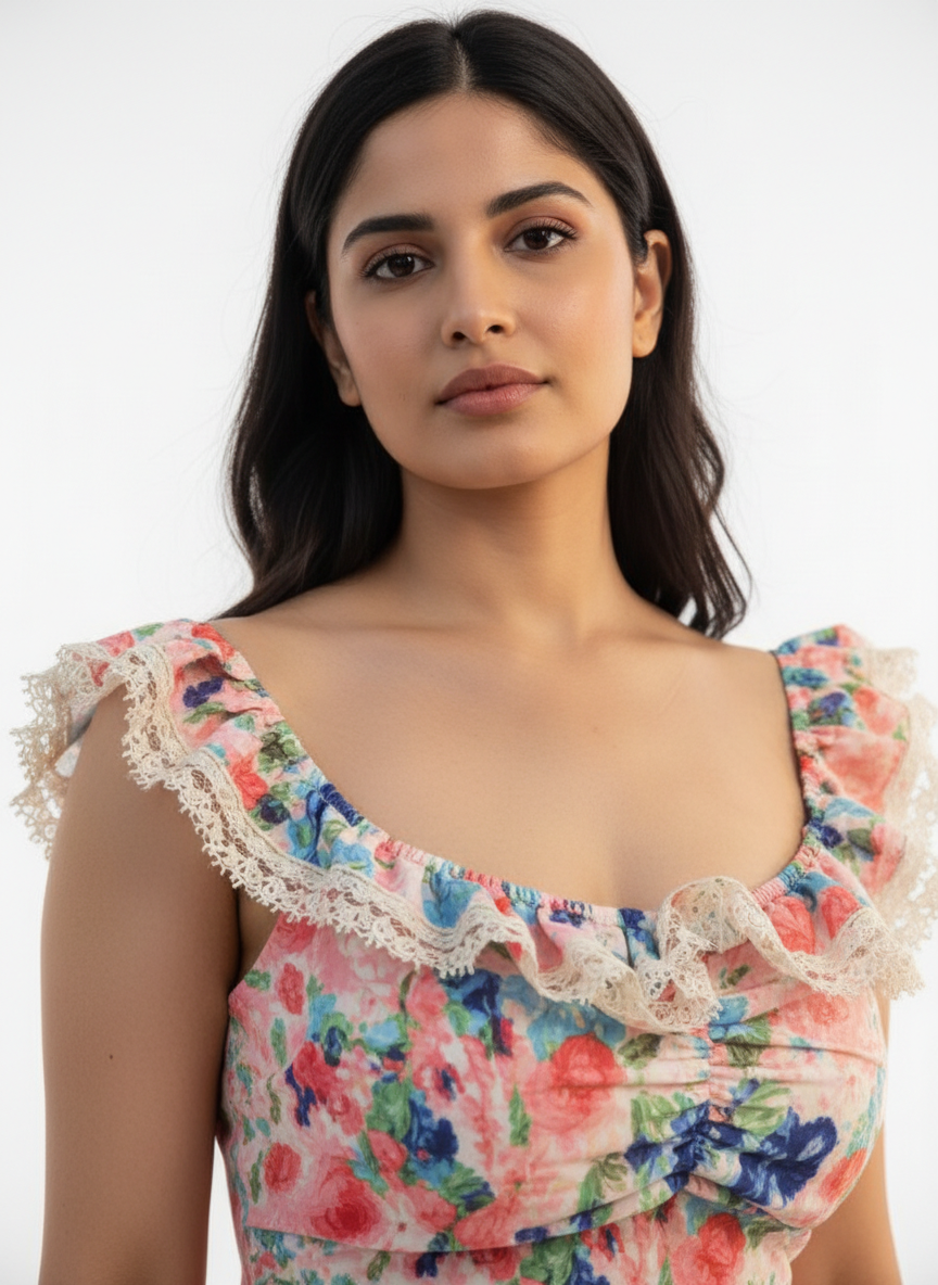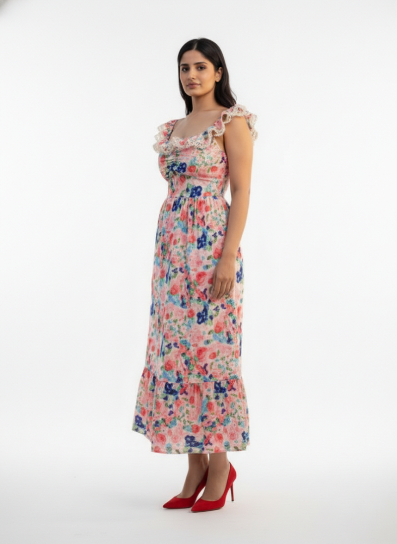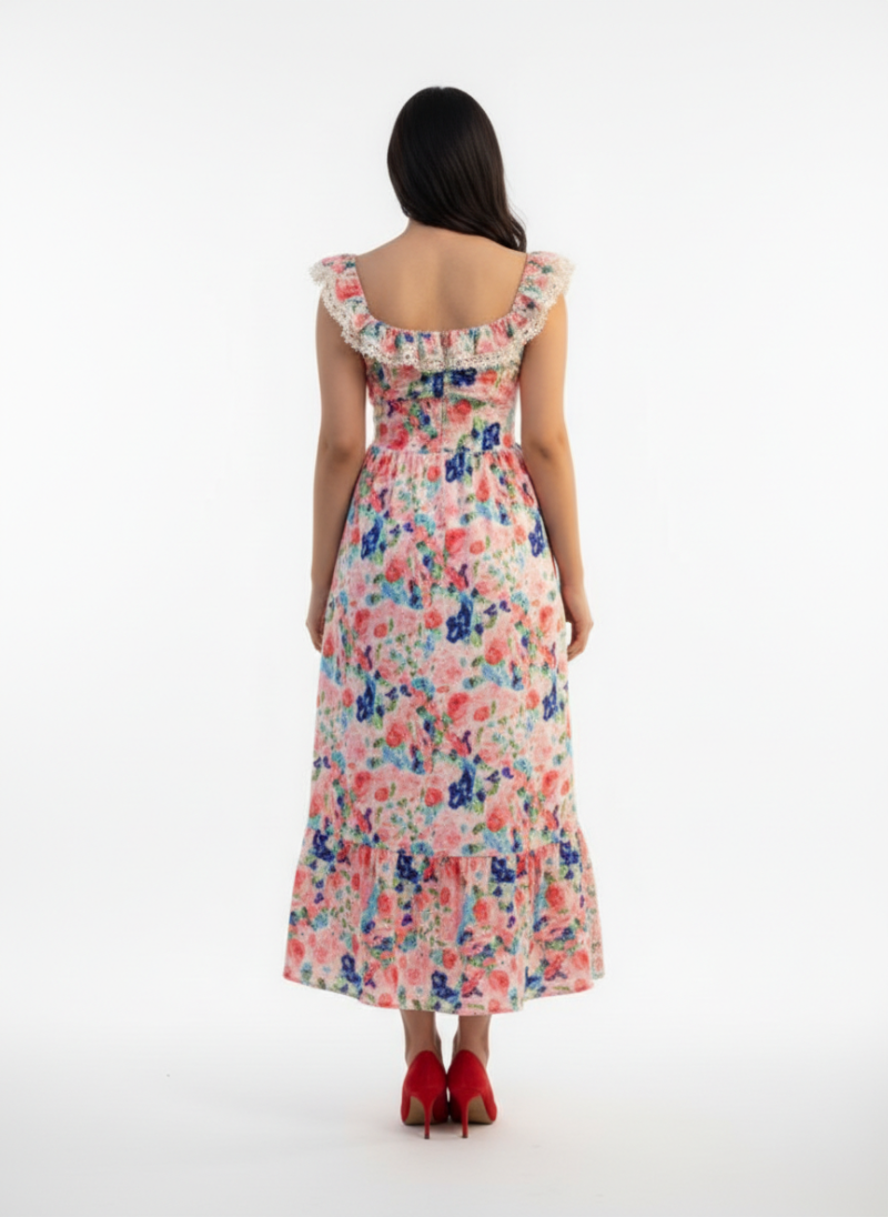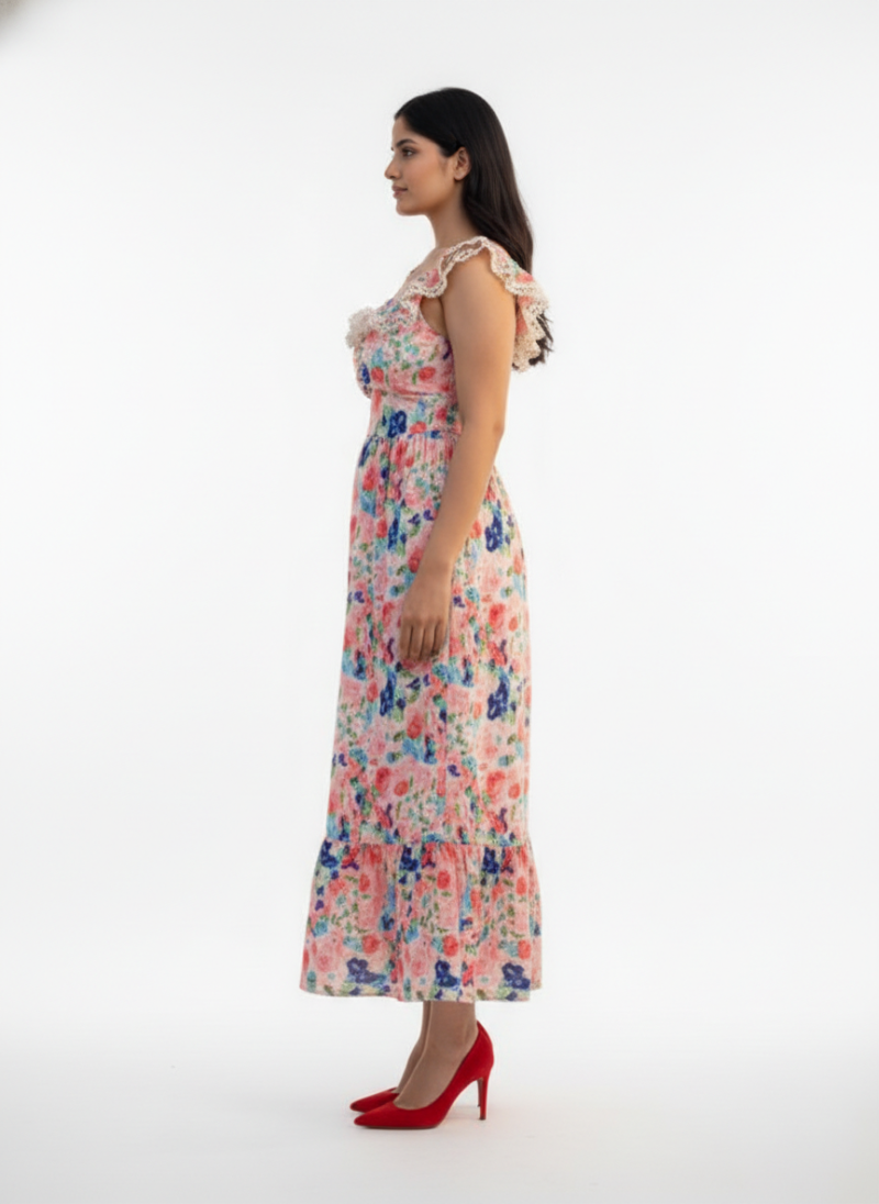 A floral print midi dress featuring a ruffled scoop neckline with lace trim, a cinched waistline, and a tiered skirt.