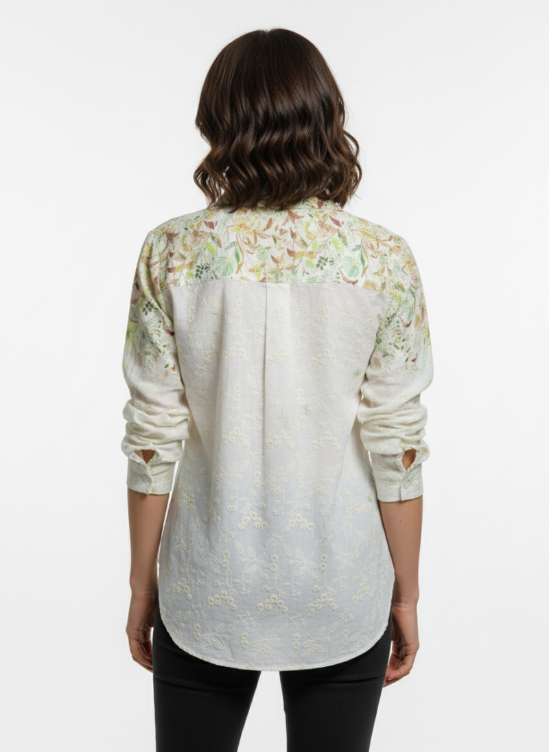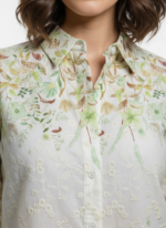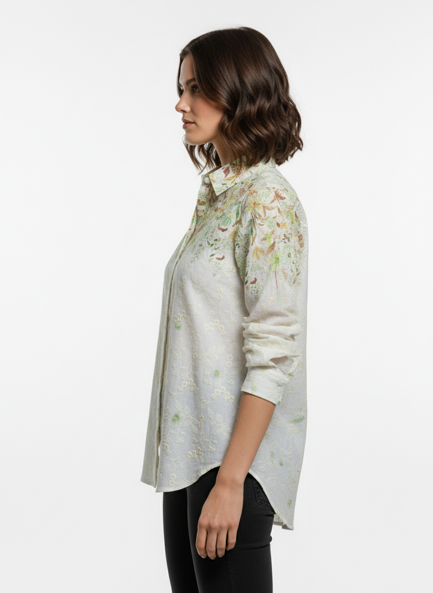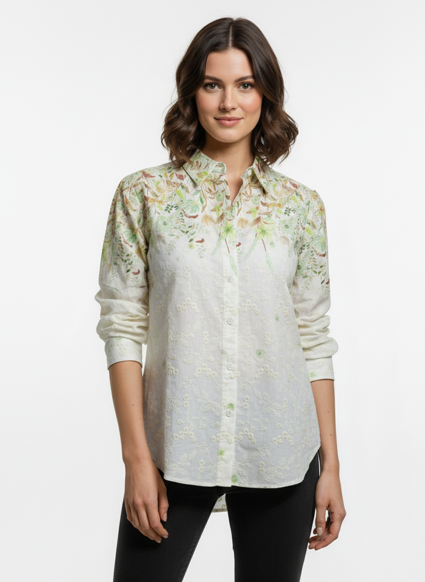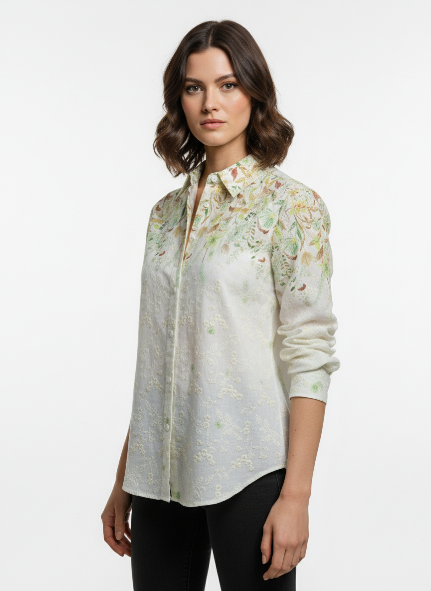 A white long-sleeved button-up shirt featuring a delicate green and brown botanical print on the shoulders and collar, complemented by a subtle white floral embroidery throughout.