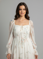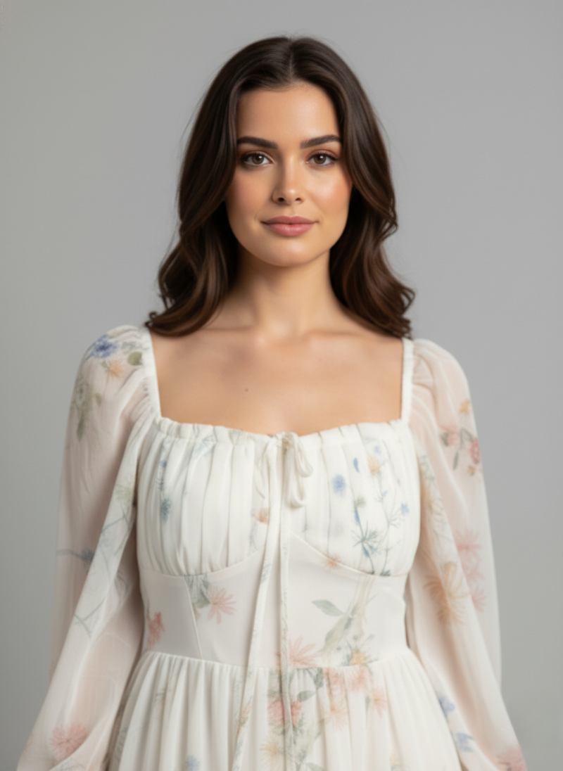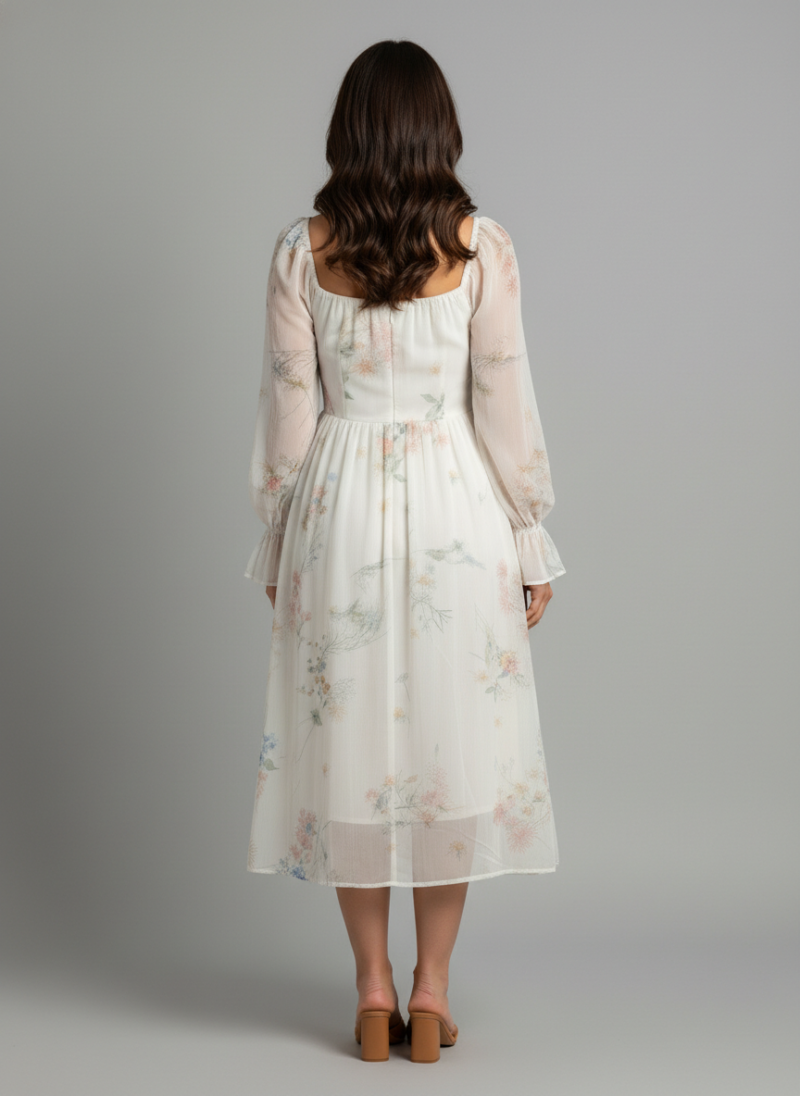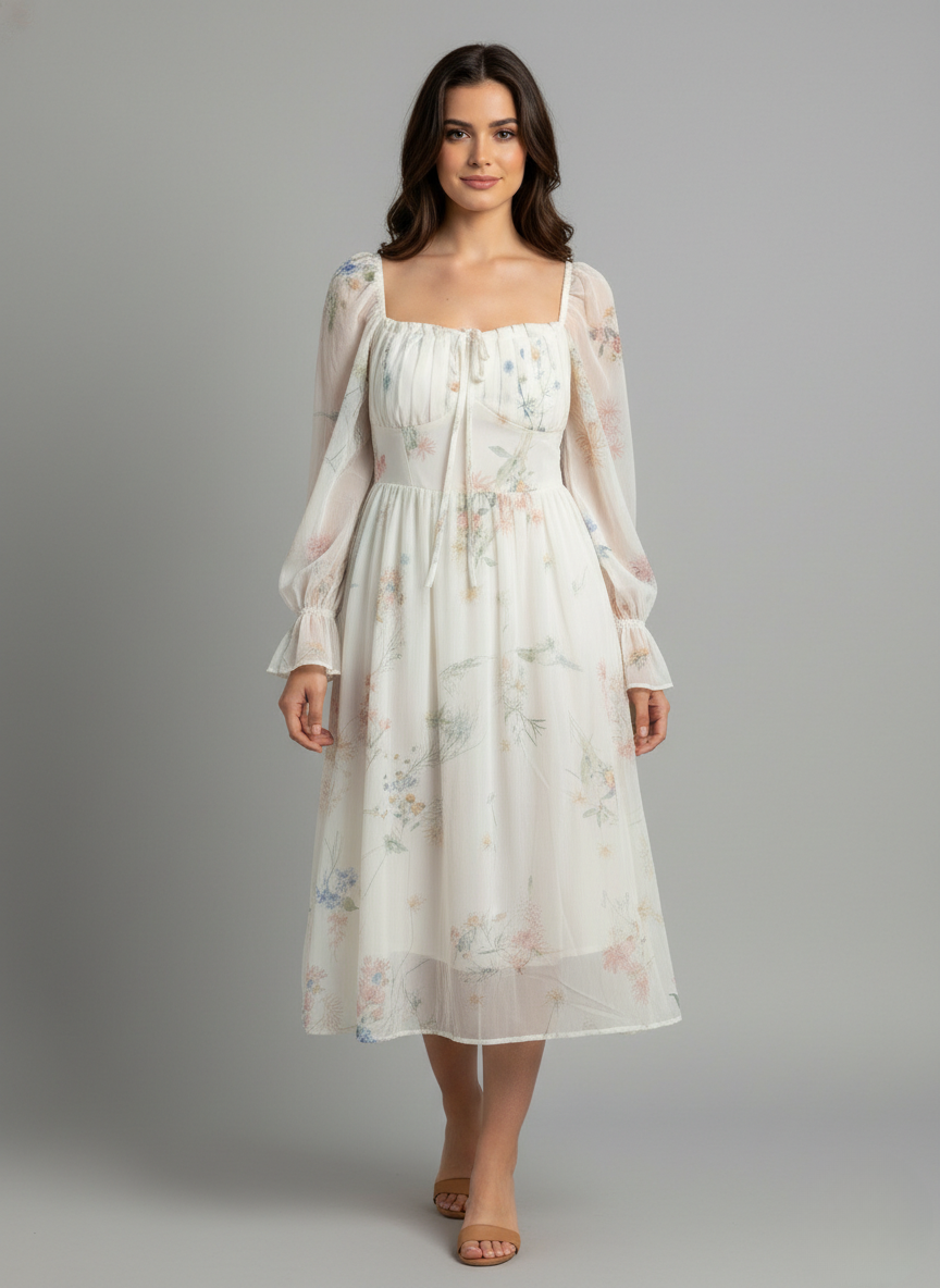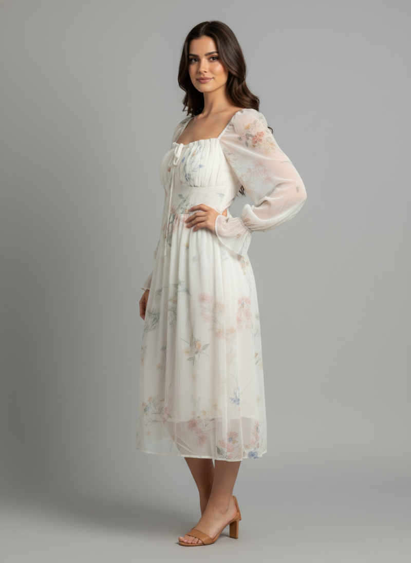 A flowy white midi dress featuring a delicate pastel floral print, long sheer puffed sleeves with ruffled cuffs, and a gathered bust with a tie detail.