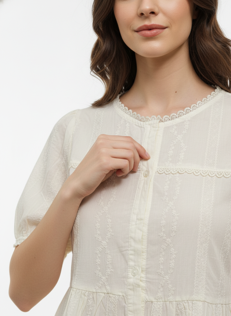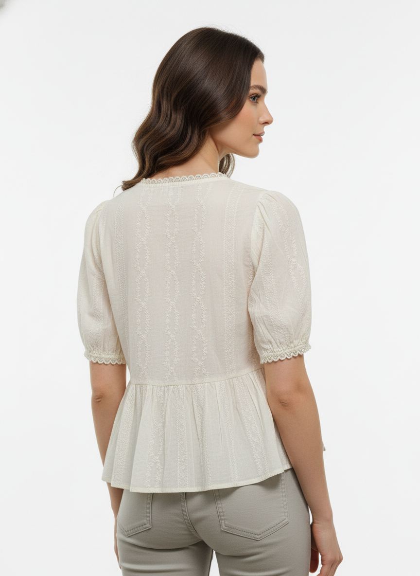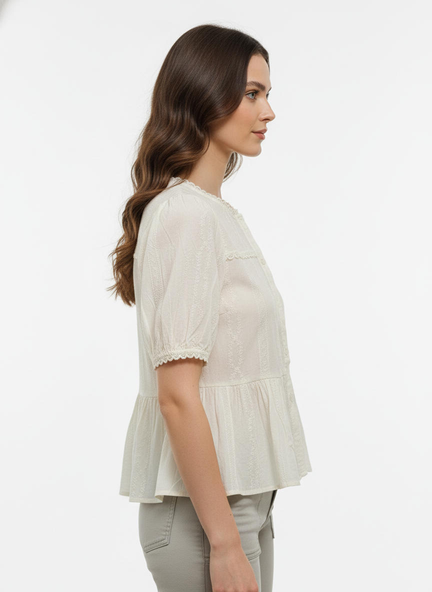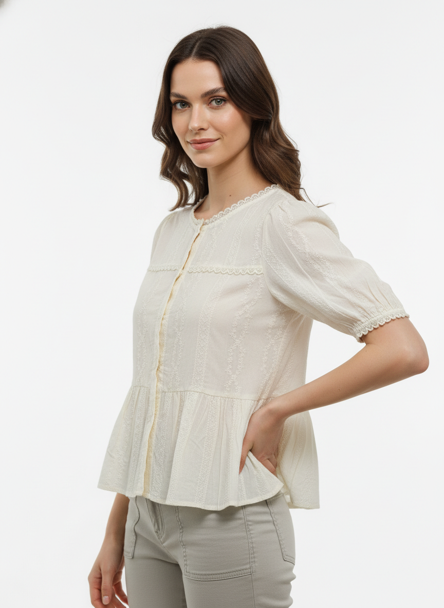A light-colored, short-sleeved blouse featuring intricate lace detailing along the neckline, sleeves, and across the chest, with a button-down front and a subtle peplum hem.