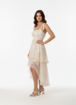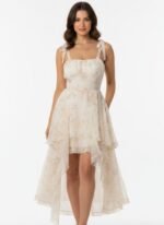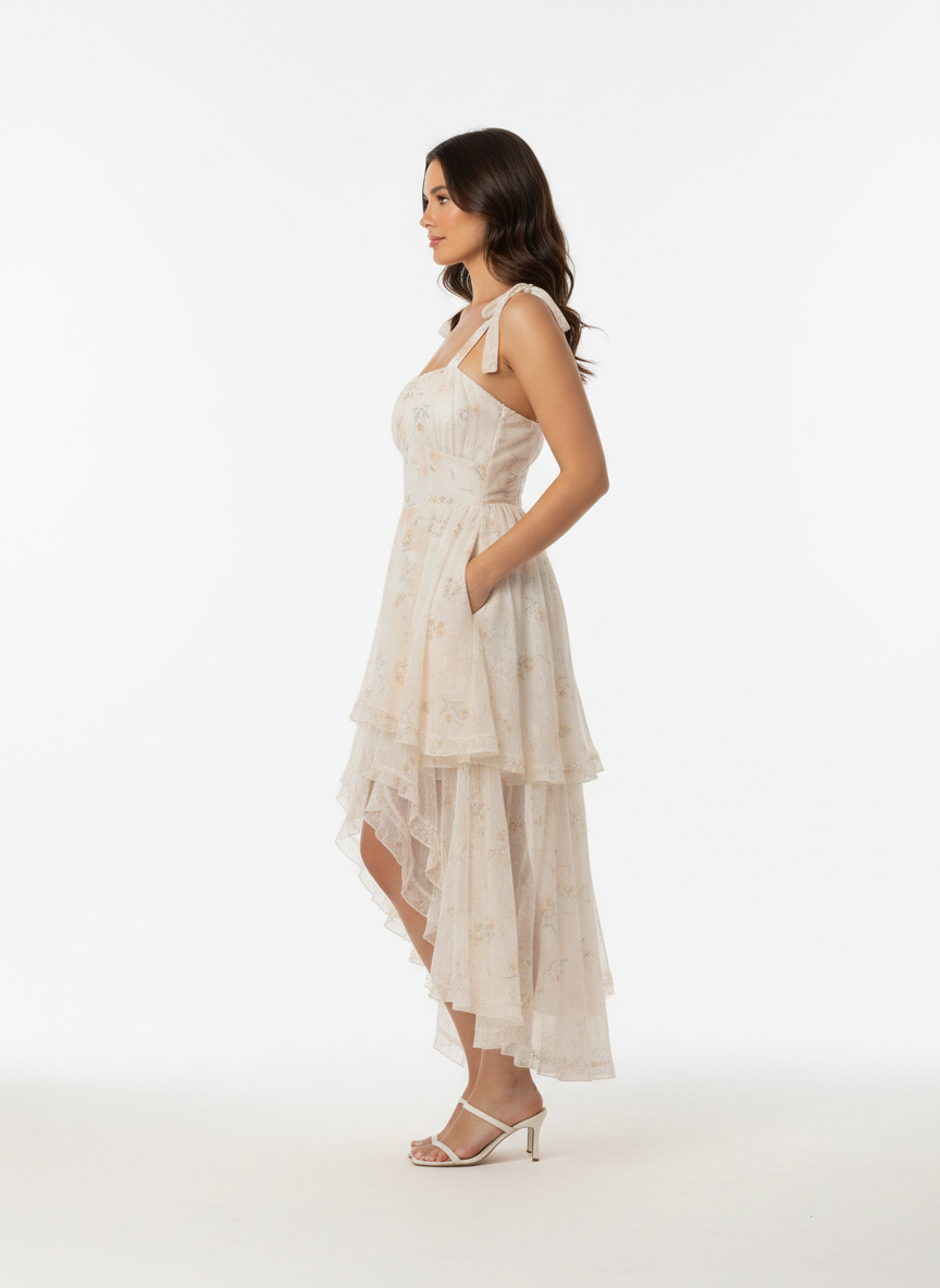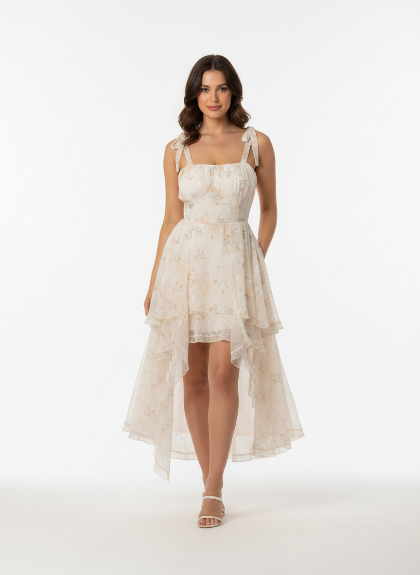 A cream-colored, floral-print dress with a high-low ruffled skirt and tie-shoulder straps.