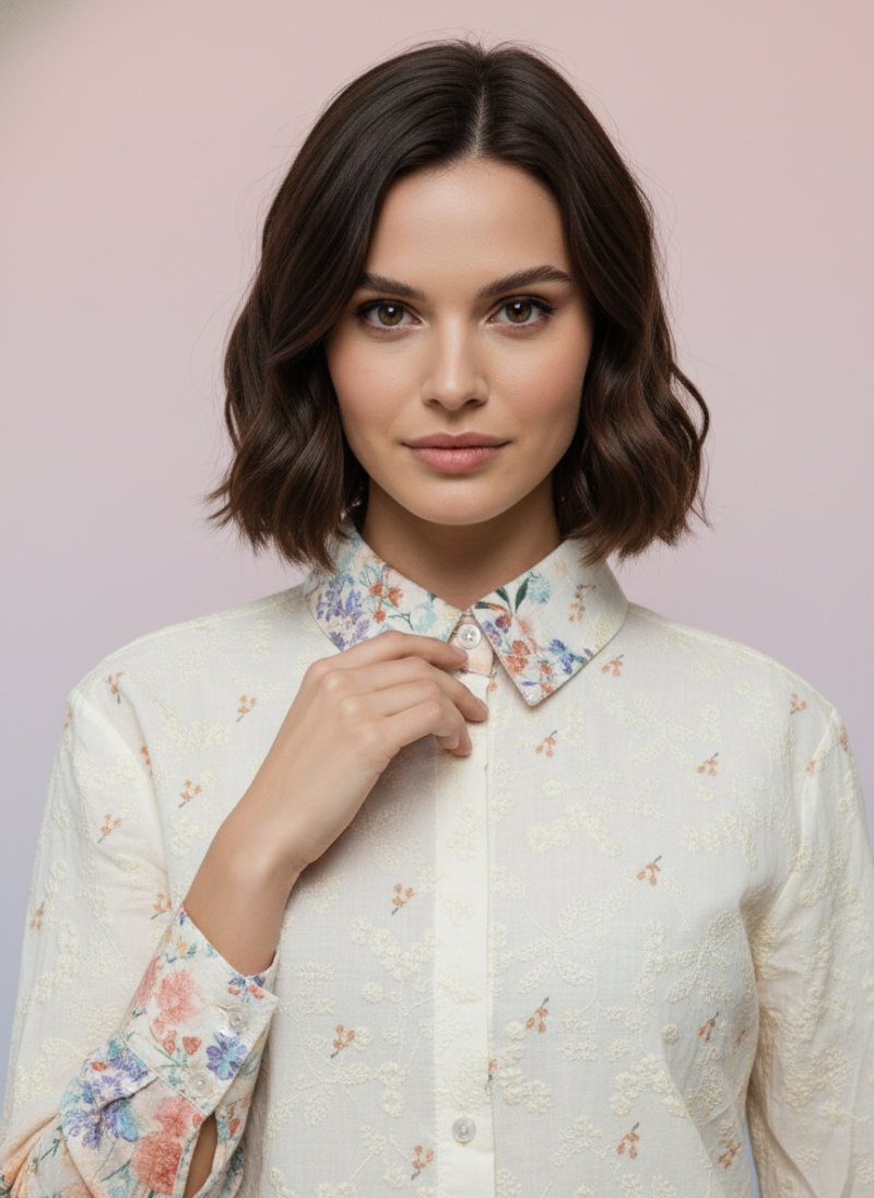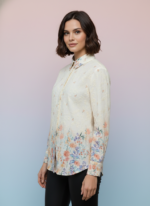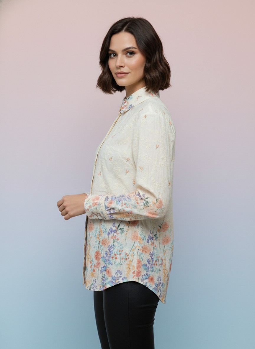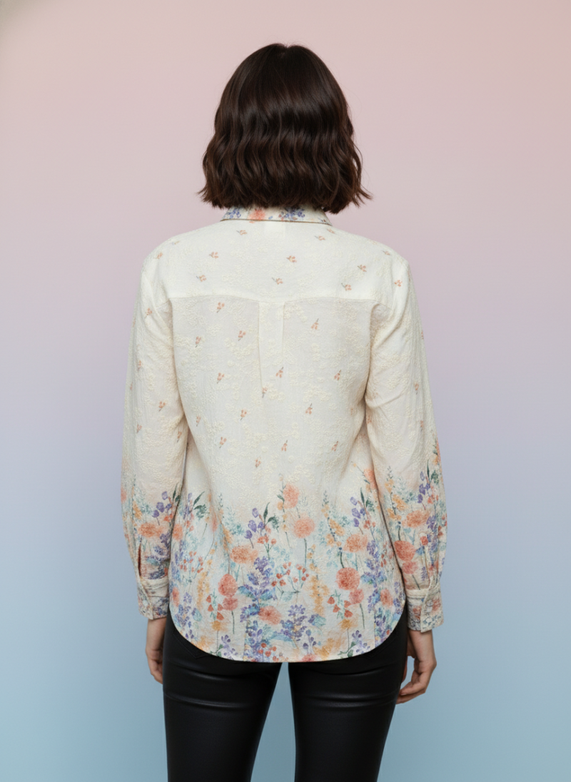 A light-colored, long-sleeved button-down shirt featuring a delicate floral print, primarily concentrated around the hemline and cuffs.