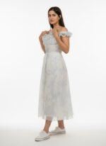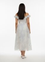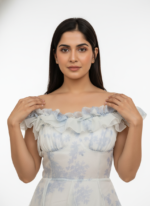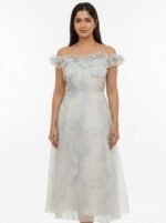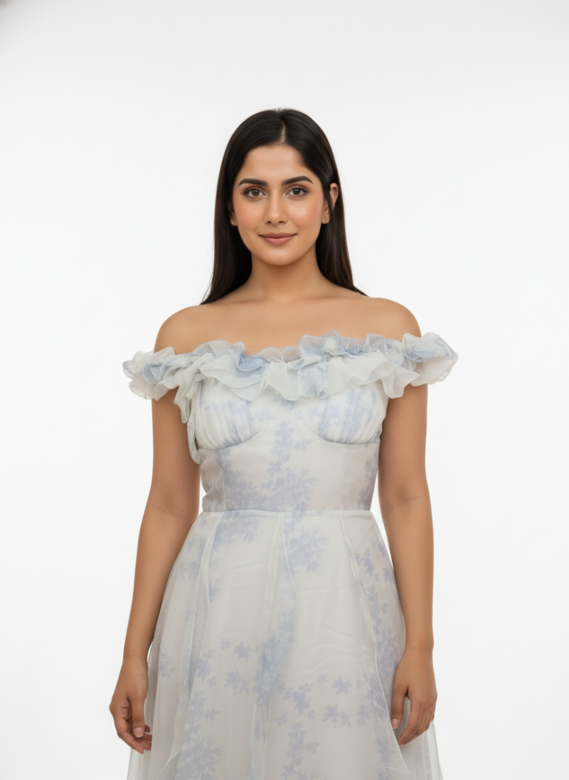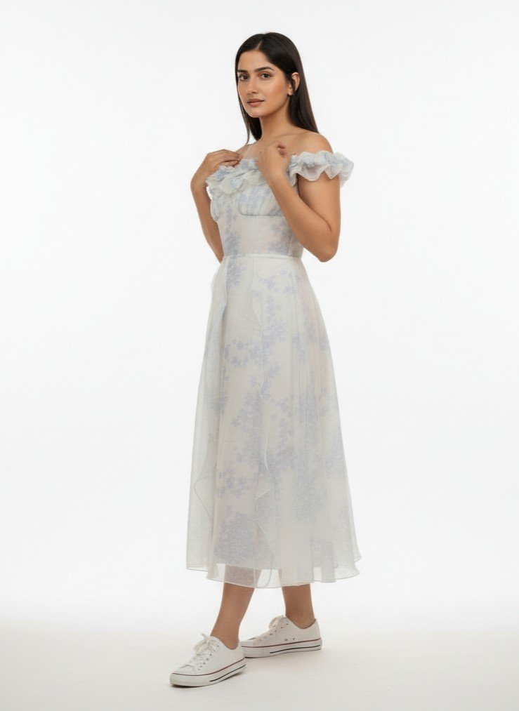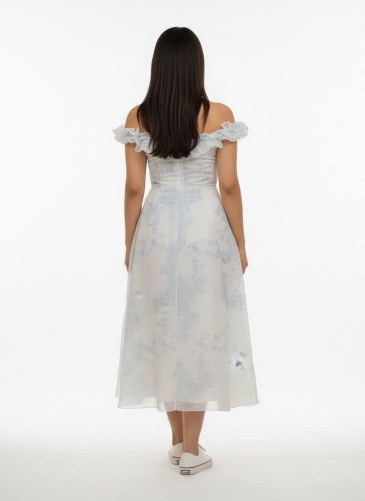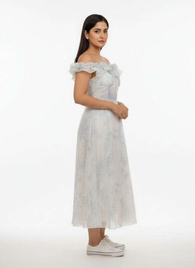 A light blue and white floral off-the-shoulder midi dress featuring a ruffled neckline and a flowing skirt with subtle vertical ruffle details.